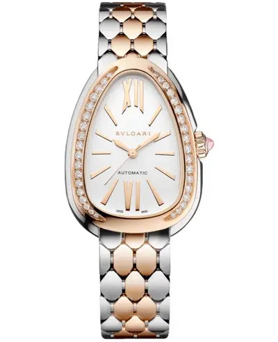 Brand New Authentic Bulgari Serpenti Seduttori Automatic White Dial Diamond Bezel Rose Gold & Stainless Steel Women's Luxury Watch Model 104058. Polished 18k Rose Gold & Stainless Steel case with Polished 18K Rose Gold and Stainless Steel Two-Tone Bracelet watch band. Polished Stainless Steel Folding clasp. Fixed with Diamonds bezel. Dial description: Luminous Rose Gold Hands with Roman Numeral & Stick Hour Markers on a White dial. Swiss Automatic movement. Powered by Bvlgari Calibre BVS 100 engine with 50 hours power reserve. Watch functions: Hour, Minute, Second, Power Reserve. Push-Pull crown. Scratch Resistant Sapphire crystal. Unique case shape. Case size: 34mm. See-Through Case Back. 30 Meters - 100 Feet water resistant. 2-year WatchMaxx warranty.