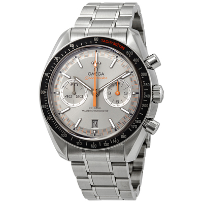 Pre-owned Stainless steel case with a stainless steel bracelet. Fixed stainless steel bezel with a black ceramic (Liquidmetal) top ring showing tachymeter markings. Grey dial with luminous grey hands and index hour markers. Minute markers around the outer rim. Dial Type: Analog. Luminescent hands and markers. Date display at the 6 o'clock position. Chronograph - two sub-dials displaying: 60 second and 12 hour. Omega calibre 9900 automatic movement, based upon Omega 9300, containing 54 Jewels, bitting at 28800 vph, and has a power reserve of approximately 60 hours. Scratch resistant sapphire crystal. Screw down crown. Transparent case back. Round case shape. Case size: 44.25 mm. Band width: 21 mm. Fold over clasp with a push button release. Water resistant at 50 meters / 165 feet. Functions: chronograph, tachymeter, date, hour, minute, second. Speedmaster Series. Luxury watch style. Watch label: Swiss Made. Omega Speedmaster Chronograph Automatic Grey Dial Mens Watch 329.30.44.51.06.001.