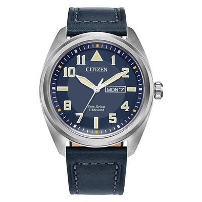 Super titanium case with a blue leather strap. Fixed super titanium bezel. Blue dial with silver-tone hands and Arabic numeral hour markers. Indexmarkers appear at the 3, 6, 9 and 12 o'clock positions. Minute markers around the outer rim. Dial Type: Analog. Luminescent hands and markers. Day of the week and date display at the 3 o'clock position. Citizen Caliber Eco-Drive E101 eco-drive movement. Scratch resistant sapphire crystal. Pull / push crown. Solid case back. Round case shape, case size: 42 mm. Band width: 20 mm. Tang clasp. Water resistant at 100 meters / 330 feet. Functions: date, day, hour, minute, second, solar-powered. Garrison Series. Casual watch style. Watch label: Japan Movt. Citizen Eco-Drive Garrison Blue Dial Mens Watch BM8568-01L.