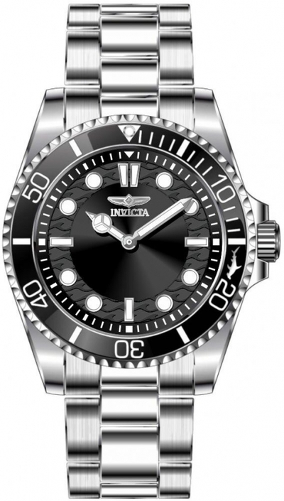 Silver-tone stainless steel case and bracelet. Uni-directional rotating two-tone (silver-tone and black) aluminum and stainless steel bezel. Black dial with silver-tone hands and index hour markers. Minute markers around the outer rim. Dial Type: Analog. Luminescent hands and markers. Hattori Caliber PC20S quartz movement. Scratch resistant mineral crystal. Screw down crown. Solid case back. Round case shape, case size: 43 mm, case thickness: 11.30 mm. Band width: 22 mm, band length: 7.25 inches. Fold over safety clasp. Water resistant at 100 meters / 330 feet. Functions: hour, minute. Pro Diver Series. Casual watch style. Watch label: Japan Movt. Invicta Pro Diver Quartz Black Dial Mens Watch 49693.