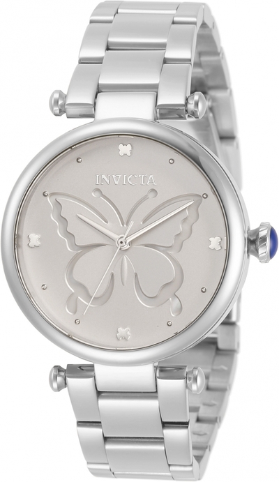 Silver-tone stainless steel case and bracelet. Fixed silver-tone stainless steel bezel. Silver dial with silver-tone hands. Dial Type: Analog. Hattori Caliber PC21AF quartz movement. Scratch resistant Flame Fusion crystal. Pull / push crown. Solid case back. Round case shape, case size: 36 mm. Band width: 18 mm, band length: 7 inches. Fold over push button clasp. Water resistant at 100 meters / 330 feet. Functions: hour, minute, second. Wildflower Series. Casual watch style. Watch label: Japan Movt. Invicta Wildflower Quartz Silver Dial Ladies Watch 33232.