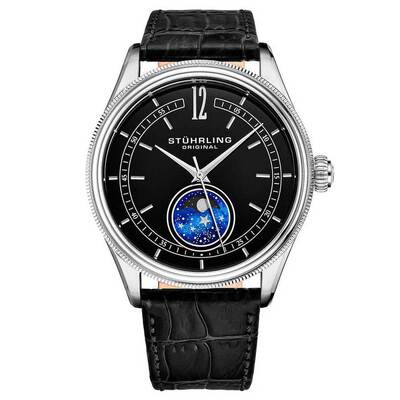 Black dial men's watch from the Stuhrling Symphony Series, model number M15522. Features stainless steel case with a fixed bezel also made of stainless steel, round 42 mm face and 10 mm thickness. Equipped with an animated moon phase function on the black dial displaying silver-tone hands and index hour markers including Arabic numerals at twelve o'clock position. Minute markers appear every five minutes around the outer rim. Analog quartz movement powered by a reliable mechanism, protected by scratch-resistant mineral crystal lens. Includes pull/push crown for setting time, solid case back, and is presented on a black leather strap using a tang clasp closure system. Water resistant capability reaches 50 meters or approximately 165 feet depth.