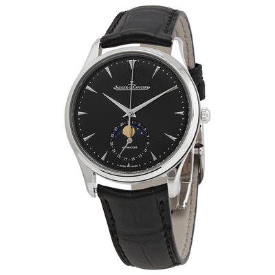 Silver-tone stainless steel case with a black alligator leather strap. Fixed silver-tone stainless steel bezel. Black dial with silver-tone hands and index hour markers. Minute markers around the outer rim. Dial Type: Analog. Date display at the 6 o'clock position. One subdial displaying: date/moonphase. Jaeger LeCoultre Calibre JLC 925 Automatic movement, containing 30 Jewels, composed of 246 parts, bitting at 28800 vph, and has a power reserve of approximately 43 hours. Scratch resistant sapphire crystal. Transparent case back. Round case shape, case size: 39 mm, case thickness: 9.9 mm. Double fold over clasp. Water resistant at 50 meters / 165 feet. Functions: moonphase, date, hour, minute, second. Master Ultra Thin Moonphase Series. Luxury watch style. Watch label: Swiss Made. Pre-owned Jaeger LeCoultre Master Ultra Thin Moon Automatic Mens Watch Q1368470.