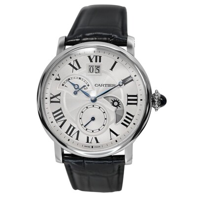 Pre-owned Stainless steel case with a black (alligator) leather strap. Fixed stainless steel bezel. Silver dial with blue hands and Roman numeral hour markers. Minute markers around the outer rim. Dial Type: Analog. Date display at the 12 o'clock position. Two displays showing: 60 second and am/pm display. Retrograde second time zone. Cartier calibre 1904-FU MC automatic movement, based upon Cartier 1904-PS MC, containing 27 Jewels, bitting at 28800 vph, and has a power reserve of approximately 48 hours. Scratch resistant sapphire crystal. Pull / push crown set with a cabochon sapphire. Skeleton case back. Round case shape. Case size: 42 mm. Case thickness: 11.96 mm. Band width: 18 mm. Deployment clasp. Water resistant at 30 meters / 100 feet. Functions: GMT, second time zone, big date, hour, minute, small second, day/night indicator. Rotonde De Cartier Series. Luxury watch style. Watch label: Swiss Made. Cartier Rotonde Automatic Silver Dial Mens Watch W1556368.