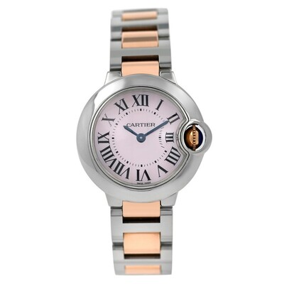 Pre-owned Stainless steel case with a stainless steel bracelet with 18kt rose gold links. Fixed stainless steel bezel. Pink mother of pearl dial with blue hands and black Roman numeral hour markers. Minute markers around an inner ring. Dial Type: Analog. Luminescent hands and dial markers. Cartier quartz movement. Scratch resistant sapphire crystal. Fluted crown set with a synthetic cabochon-shaped spinel. Solid case back. Case diameter: 28.5 mm. Case thickness: 9.35 mm. Round case shape. Band width: 13.7 mm. Band length: 6 inches. Hidden fold over clasp. Water resistant at 30 meters / 100 feet. Functions: hours, minutes. Luxury watch style. Watch label: Swiss Made. Cartier Ballon Bleu de Cartier Small Gold and Steel Watch W6920034.