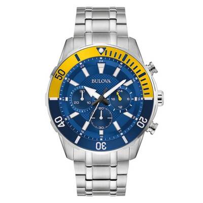 Silver-tone stainless steel case and bracelet. Rotating blue and yellow stainless steel bezel. Blue dial with silver-tone hands and index hour markers. Minute markers around the outer rim. Dial Type: Analog. Luminescent hands and markers. Chronograph - three sub-dials displaying: 60 second, 30 minute and 24 hour. Quartz movement. Scratch resistant mineral crystal. Round case shape, case size: 44 mm. Deployment with push button release clasp. Water resistant at 100 meters / 330 feet. Functions: chronograph, hour, minute, second. Classic Series. Sport watch style. Watch label: Japan Movt. Bulova Classic Chronograph Quartz Blue Dial Mens Watch 98A245.