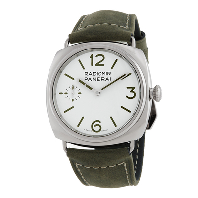 Silver-tone stainless steel case with a suede leather strap. Fixed silver-tone stainless steel bezel. White dial with silver-tone hands and index hour markers. Dial Type: Analog. Luminescent hands and markers. One subdial displaying: small second. Panerai Calibre P.6000 Hand Wind movement, containing 19 Jewels, bitting at 21600 vph, and has a power reserve of approximately 72 hours. Scratch resistant sapphire crystal. Solid case back. Round case shape, case size: 45 mm. Water resistant at 100 meters / 330 feet. Functions: hour, minute, small second. Radiomir Series. Luxury watch style. Watch label: Swiss Made. Pre-owned Panerai Radiomir Officine 45mm Hand Wind White Dial Mens Watch PAM01384.
