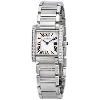 This Cartier Tank Francaise quartz watch features a sophisticated square stainless steel case paired with an elegant stainless steel bracelet. The fixed bezel is meticulously set with 24 sparkling diamonds weighing approximately 0.49 carats, adding a touch of luxury to the classic design.