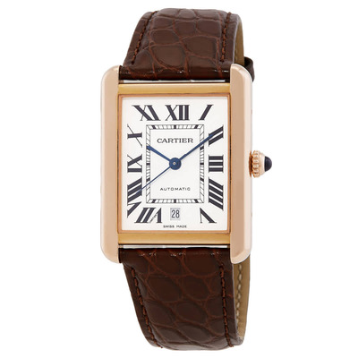 18kt pink gold rectangular case with brown alligator leather strap. Fixed 18kt pink gold bezel, white dial featuring blue steel hands and Roman numeral hour markers on an inner ring. Minute markers present, automatic movement (Cartier Calibre 049 / ETA 2892-A2) with 21 jewels, beats per hour: 28800 vph, power reserve approx. 42 hours. Sapphire crystal glass is scratch resistant. Date display at the 6 o'clock position. Push/pull crown set with a blue cabochon insert. Solid case back. Water resistant to 30 meters / 100 feet. Functions include hour, minute, second, and date indication.