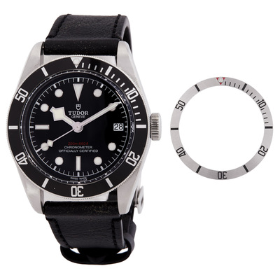 Silver-tone stainless steel case with a black aged leather strap. Uni-directional rotating silver-tone stainless steel bezel. Black dial with silver-tone hands and dot hour markers. Minute markers around the outer rim. Dial Type: Analog. Luminescent hands and markers. Date display at the 3 o'clock position. Tudor Calibre MT5612 automatic movement with a 70-hour power reserve. Scratch resistant sapphire crystal. Screw down crown. Solid case back. Round case shape. Case size: 41 mm. Band width: 20 mm. Fold through clasp. Water resistant at 200 meters / 660 feet. Functions: date, hour, minute, second, chronometer. Dress watch style. Watch label: Swiss Made. Pre-owned Tudor Heritage Black Bay Chronometer Automatic Mens Leather Watch M79730-0003.