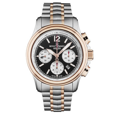 Silver-tone stainless steel case with a two-tone (silver-tone and rose gold-tone) stainless steel bracelet. Fixed rose gold-tone stainless steel bezel. Black dial with rose gold-tone hands and index hour markers. Minute markers around the outer rim. Dial Type: Analog. Luminescent hands and markers. Between the 4 and 5 o'clock position. Chronograph - three sub-dials displaying: 60 second, 30 minute and 12 hour. Automatic movement. Scratch resistant sapphire crystal. Screw down crown. Transparent case back. Round case shape, case size: 44 mm, case thickness: 16 mm. Band width: 22 mm. Fold over clasp. Water resistant at 100 meters / 330 feet. Functions: chronograph, date, hour, minute, second. Additional Info: hour, minute, second, date, chrnograph. Air Speed Series. Luxury watch style. Watch label: Swiss Made. Revue Thommen Air Speed Chronograph Automatic Black Dial Mens Watch 16041.6457.
