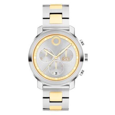 Silver-tone stainless steel case with a two-tone (silver-tone and gold-tone) stainless steel bracelet. Fixed silver-tone stainless steel bezel. Silver-tone dial with gold-tone hands and index hour markers. Minute markers around the outer rim. Dial Type: Analog. Date display at the 6 o'clock position. Chronograph - three sub-dials displaying: 60 second, 30 minute and 1/10th of a second. Quartz movement. Scratch resistant K1 crystal. Pull / push crown. Solid case back. Round case shape, case size: 39 mm. Fold over clasp with a safety release. Water resistant at 50 meters / 165 feet. Functions: chronograph, date, hour, minute, second. Trend Propel Series. Casual watch style. Watch label: Swiss Made. Movado Trend Propel Chronograph Quartz Silver Dial Watch 3601003.