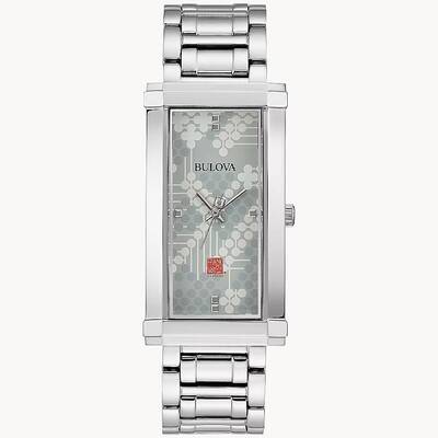 Silver-tone stainless steel case and bracelet. Fixed silver-tone stainless steel bezel. Pattern dial with silver-tone hands and dots hour markers. Dial Type: Analog. Quartz movement. Scratch resistant mineral crystal. Pull / push crown. Solid case back. Rectangle case shape, case size: 24.6 mm. Band width: 18 mm. Deployment with push button release clasp. Water resistant at 30 meters / 100 feet. Functions: hour, minute, second. Pattern No.106 Series. Dress watch style. Bulova Pattern No.106 Quartz Ladies Watch 96L286.