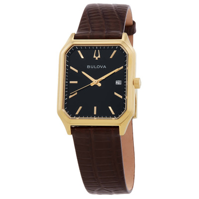 Gold-tone stainless steel case with a brown leather strap. Fixed gold-tone stainless steel bezel. Black dial with gold-tone hands and index hour markers. Minute markers around the outer rim. Dial Type: Analog. Date display at the 3 o'clock position. Quartz movement. Scratch resistant sapphire crystal. Pull / push crown. Solid case back. Unique case shape, case size: 32 mm. Band width: 20 mm. Buckle clasp. Water resistant at 30 meters / 100 feet. Functions: date, hour, minute, second. We Are All Here Series. Dress watch style. Bulova We are All Here Quartz Black Dial Ladies Watch 97B235.