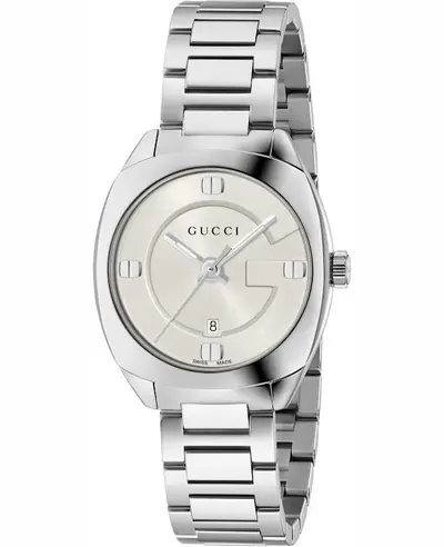 Brand New Authentic Gucci GG2570 White Dial Steel Women's Watch Model YA142502. Stainless Steel case with Stainless Steel watch band. Deployment with Push Button clasp. Fixed bezel. Dial description: Silver tone hands and Index hour markers on a White dial. Battery Operated Quartz movement. Watch functions: Date, Hour, Minute, Second. Screw Down crown. Scratch Resistant Sapphire crystal. Round case shape. Case size: 29mm. Case thickness: 7mm. Solid case back. 50 Meters - 165 Feet water resistant. 2-year WatchMaxx warranty.