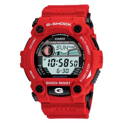 Red resin case and strap. Fixed red resin bezel. Digital dial. Dial Type: digital. Full auto-calendar (to year 2099). Quartz movement. Scratch resistant mineral crystal. Solid case back. Round case shape, case size: 52.4 x 50 mm, case thickness: 17.7 mm. Buckle clasp. Water resistant at 200 meters / 660 feet. Functions: hour, minute, second, pm, month, date, day, 12/24-hour format, timer, flash alert feature, alarm, stopwatch, moon data. G-shock Series. Sport watch style. Casio G-Shock Alarm Quartz Digital Mens Watch G-7900A-4DR.