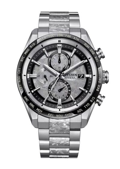 Grey titanium case and bracelet. Black titanium bezel. Silver-tone dial with silver-tone hands and index hour markers. Minute markers around the outer rim. Dial Type: Analog. Luminescent hands and markers. Date display at the 3 o'clock position. H800 eco-drive movement. Scratch resistant sapphire crystal. Solid case back. Round case shape, case size: 42 mm. Fold over clasp with a safety release. Water resistant at 100 meters / 330 feet. Functions: perpetual calendar. Attesa Series. Casual watch style. Watch label: Japan Movt. Citizen Attesa Perpetual Silver Dial Mens Watch AT8284-61A.