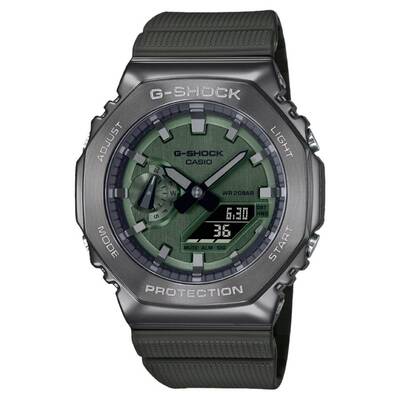 Resin/stainless steel case with a green resin strap. Fixed resin/stainless steel bezel. Green dial with black hands and index hour markers. Minute markers around the outer rim. Dial Type: Analog-digital. Luminescent double led light. Full auto-calendar (to year 2099). Quartz movement. Scratch resistant mineral glass crystal. Solid case back. Round case shape, case size: 49.3 x 44.4 mm, case thickness: 11.8 mm. Buckle clasp. Water resistant at 200 meters / 660 feet. Functions: hour, minute, second, pm, month, date, world time, timer, stopwatch, alarm, 12/24-hour format. G-shock Series. Sport watch style. Casio G-Shock World Time Quartz Analog-Digital Green Dial Mens Watch GM-2100B-3ADR.