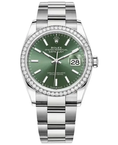 Brand New Authentic Rolex Datejust 36 White Gold & Diamonds Mint Green Dial Women's Luxury Watch Model M126284RBR-0044. Polished White Gold and Stainless Steel case with White Gold and Stainless Steel Oyster Style Bracelet watch band. Polished Stainless Steel Oysterclasp clasp. Fixed-Diamond bezel. Dial description: Luminescent White Gold Hands and Stick Hour Markers With Minute Markers Around the Outer Rim on a Mint Green dial. Automatic Self Winding movement. Powered by CALIBRE 3235 engine with 70 hours power reserve. Screw Down crown. Scratch Resistant Sapphire crystal. Round case shape. Case size: 36mm. Solid case back. 100 Meters - 330 Feet water resistant. 5-year WatchMaxx warranty.