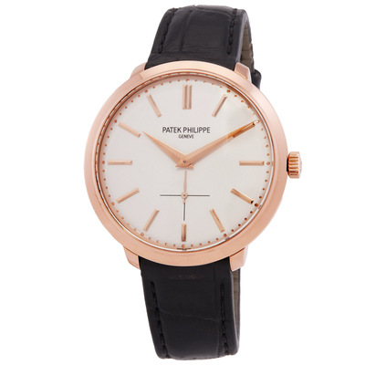 18kt rose gold case with a black leather strap. Fixed 18kt rose gold bezel. Silver dial with gold-toned dauphine-style shape hands and index hour markers. Minute markers around the outer rim. Dial Type: Analog. One subdial displaying: small second at the 6 o'clock position. Patek Philippe Calibre 215 PS Hand Wind movement, based upon Patek Philippe 215, containing 18 Jewels, bitting at 28800 vph, and has a power reserve of approximately 44 hours. Scratch resistant sapphire crystal. Pull / push crown. Transparent case back. Round case shape, case size: 38 mm. Tang clasp. Water resistant at 30 meters / 100 feet. Functions: hour, minute, small second. Calatrava Series. Luxury watch style. Watch label: Swiss Made. Pre-owned Pre-owned Patek Philippe Calatrava Silver Dial 18k Rose Gold Brown Leather Mens Watch 5123R-001.