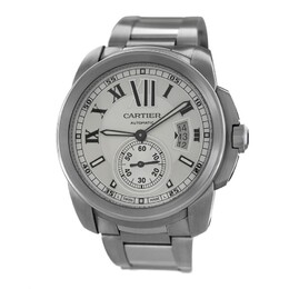 Pre-owned Stainless steel case with a stainless steel bracelet. Fixed stainless steel bezel. Silver opaline dial with luminous hands and Roman numeral hour markers. Arabic numeral minute markers (at 5 minute intervals). Minute markers around the outer rim. Dial Type: Analog. Luminescent hands and markers. Date display appears at the 3 o'clock position. Small seconds sub-dial. Cartier calibre 1904PS MC automatic movement with a 48-hour power reserve. Scratch resistant sapphire crystal. Steel crown with a faceted blue synthetic spinel. Skeleton case back. Case size: 42 mm. Case thickness: 10 mm. Round case shape. Band width: 24 mm. Deployment clasp. Water resistant at 30 meters/ 100 feet. Functions: hours, minutes, seconds, calendar. Dress watch style. Watch label: Swiss Made. Cartier Calibre de Cartier Silver Dial Stainless Steel Automatic Mens Watch W7100015.
