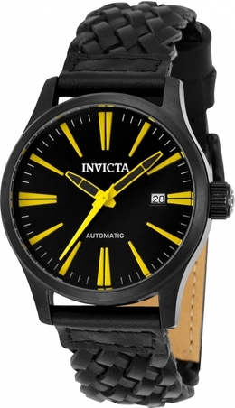 Black ion-plated stainless steel case with a black platted leather strap. Fixed black ion-plated bezel. Black dial with luminous yellow hands and index hour markers. Minute markers around the outer rim. Dial Type: Analog. Luminescent hands and markers. Date display at the 3 o'clock position. Caliber: NH35A automatic movement with a 41-hour power reserve. Scratch resistant flame fusion crystal. Pull / push crown. Transparent case back. Case size: 42 mm. Case thickness: 14 mm. Round case shape. Band width: 22 mm. Band length: 8.25 inches. Tang clasp. Water resistant at 30 meters / 100 feet. Functions: date, hour, minute, second. Casual watch style. Invicta I-Force Automatic Black Dial Mens Watch 23779.