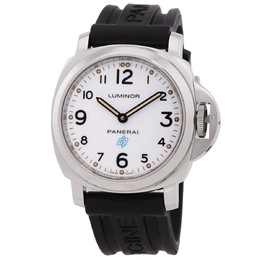 Silver-tone stainless steel case, blue leather strap, fixed silver-tone bezel. White dial with luminous black hands and Arabic numeral hour markers, minute markers around the outer rim. Analog dial type, luminous markers and hands. Panerai Calibre OP I hand-wound movement, 17 jewels, 21600 vph, 56-hour power reserve. Scratch-resistant sapphire crystal, screw-down crown, solid case back, cushion shape. 44mm diameter, 15.6mm thickness. 20mm band width, tang clasp. 100-meter / 330-foot water resistance. Hour and minute functions. Suitable for snorkeling and swimming but not diving. Swiss Made. Pre-owned condition.