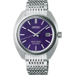 Silver-tone stainless steel case and bracelet, fixed silver-tone bezel, purple dial with silver-tone hands and index hour markers, minute markers around outer rim, analog dial type, date display at 3 o'clock, Seiko Caliber 6L35 automatic movement, scratch resistant sapphire crystal, cushion case shape, case size 39.4mm thickness 9.9mm, band width 19mm, deployment clasp, water resistant to 50 meters, functions include date hour minute second, King Seiko Series, dress watch style, Japan movement.