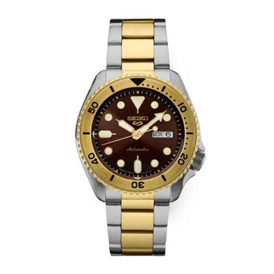 Silver-tone stainless steel case, two-tone (silver and gold) stainless steel bracelet, gold-tone bezel, brown dial with gold-tone hands and dot markers, minute markers, analog dial, day and date display at 3 o'clock, Seiko Caliber 4R36 automatic movement (24 jewels, 21600 vph, 41-hour power reserve), screw-down crown, transparent case back, round case (42.5mm diameter, 13.4mm thick), fold-over clasp with safety release, 100m water resistance, date, day, hour, minute, second functions, 5 Sports Series dress watch, Japan movement.