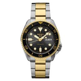 Automatic movement, Charcoal dial, Gold-tone hands, Black bezel insert, Hardlex crystal, Date display, Day display, Analog dial, 24 Jewel movement, 21600 vph, 41 hour power reserve, Stainless steel bracelet, Silver-tone case, Two-tone bracelet, Uni-directional bezel, Round case, 42.5mm diameter, 13.4mm thick, 22mm band width, Fold over clasp with safety release, Water resistant to 100 meters, 330 feet
