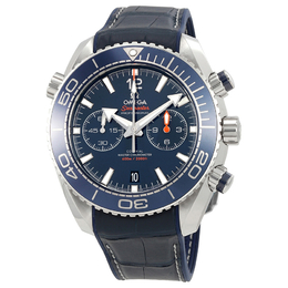 Silver-tone stainless steel case with a blue alligator leather with rubber lining strap. Uni-directional rotating coin edge stainless steel with a blue aluminium top ring bezel with a silver-tone count-up elapsed time top ring. Blue dial with luminous silver-tone arrow-shaped hands and index hour markers. Minute markers around the outer rim. Dial Type: Analog. Luminescent hands and markers. Date display at the 6 o'clock position. Chronograph - two sub-dials displaying: 60 seconds, and 12 hours. Omega Calibre 9900 Automatic movement, based upon Omega 9300, containing 54 Jewels, bitting at 28800 vph, and has a power reserve of approximately 60 hours. Scratch resistant sapphire crystal. Screw down crown. Transparent case back. Round case shape, case size: 45.5 mm, case thickness: 18.87 mm. Band width: 22 mm. Deployment with push button release clasp. Water resistant at 600 meters / 2000 feet. Functions: chronograph, date, hour, minute, second, co-axial escapement, chronometer. Seamaster Planet Ocean Series. Luxury watch style. Watch label: Swiss Made. Pre-owned Omega Seamaster Planet Ocean Chronograph Automatic Chronometer Blue Dial Mens Watch 215.33.46.51.03.001.