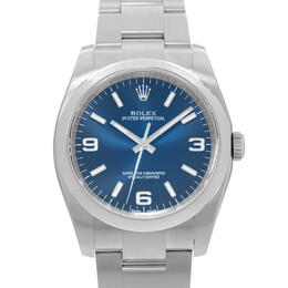 Silver-tone stainless steel case, blue dial with luminous hands and index markers, silver-tone stainless steel Oyster bracelet with fixed bezel. Automatic Caliber 3130 movement with 31 jewels, 28800 vph, 48-hour power reserve. Sapphire crystal, screw-down crown, solid case back, 36mm round case, fold-over clasp, water resistant to 100m (330ft). Functions: Hours, Minutes, Seconds, Chronometer. Oyster Perpetual 36 Series, Swiss Made.
