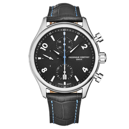 Silver-tone stainless steel case with a black/blue leather strap. Fixed silver-tone stainless steel bezel. Black dial with silver-tone hands and Arabic numeral/index hour markers. Minute markers around the outer rim. Dial Type: Analog. Luminescent hands. Date display at the 6 o'clock position. Chronograph - sub-dials displaying: 12 hours, 30 minutes, 60 seconds. Frederique Constant Calibre FC-392 Automatic movement, based upon ETA 7750, containing 25 Jewels, bitting at 28800 vph, and has a power reserve of approximately 42 hours. Scratch resistant sapphire crystal. Screw down crown. Transparent see through case back. Round case shape, case size: 42 mm, case thickness: 14.50 mm. Folding clasp. Water resistant at 50 meters / 165 feet. Functions: chronograph, date, hour, minute, second. Runabout Series. Sport watch style. Watch label: Swiss Made. Frederique Constant Runabout Automatic Black Dial Mens Watch FC-392RMG5B6.
