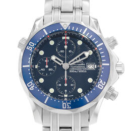 Silver-tone stainless steel case and bracelet. Uni-directional rotating blue stainless steel bezel. Blue dial with silver-tone hands and index hour markers. Minute markers around the outer rim. Dial Type: Analog. Luminescent hands and markers. Date display at the 3 o'clock position. Chronograph - three sub-dials displaying: 60 second, 30 minute and 12 hour. Omega Calibre 1164 Automatic movement, based upon ETA 7750, containing 25 Jewels, bitting at 28800 vph, and has a power reserve of approximately 44 hours. Scratch resistant sapphire crystal. Screw down crown. Solid case back. Round case shape, case size: 41 mm. Fold over clasp with a safety release. Water resistant at 300 meters / 1000 feet. Functions: chronograph, date, hour, minute, second, chronometer. Seamaster Diver Series. Dive watch style. Watch label: Swiss Made. Pre-owned Omega Seamaster Diver Chronograph Automatic Chronometer Blue Dial Mens Watch 2599.80.00.