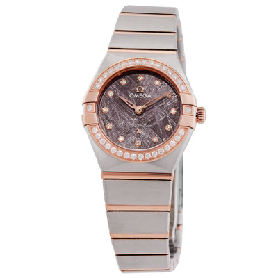 Omega Constellation Quartz Diamond Purple Dial Ladies Watch. Two-tone (silver-tone and rose gold-tone) stainless steel and 18k rose gold case and bracelet. Fixed rose gold-tone bezel set with 18k rose gold and diamonds. Purple dial accented with rose gold-tone hands and diamond hour markers. Analog dial. Powered by a quartz movement. Scratch-resistant sapphire crystal. Solid case back. Round case shape measuring 25 mm. Equipped with a fold-over clasp featuring a safety release mechanism. Water-resistant to 30 meters (100 feet). Functions include hours and minutes. Part of the Constellation series. Dress watch style. Swiss Made.