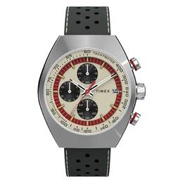 Silver-tone stainless steel case, leather strap, fixed silver-tone bezel, beige dial with silver-tone hands and index hour markers, minute markers, analog display, date at 3 o'clock, chronograph with 60-second, 60-minute, 12-hour sub-dials, quartz movement, scratch-resistant mineral crystal, pull/push crown, solid case back, tonneau shape, 42mm diameter, 11mm thick, 22mm band width, buckle clasp, water resistant to 50 meters, functions: chronograph, date, hour, minute, second, part of Legacy Series, sport watch style.