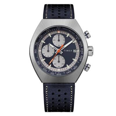 Silver-tone stainless steel case with blue leather strap. Fixed silver-tone stainless steel bezel. Blue dial featuring silver-tone hands and index hour markers with minute markers around the outer rim. Analog dial type, 3 o'clock date display. Chronograph with 60-second, 60-minute and 12-hour sub-dials. Quartz movement. Scratch-resistant mineral crystal. Pull/push crown. Solid case back. Tonneau-shaped case, 42mm diameter, 11mm thickness. Band width: 22mm. Buckle clasp. Water resistant to 50 meters / 165 feet. Functions include chronograph, date, hour, minute, second. Belongs to the Legacy Series. Sport watch style.