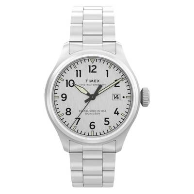 Silver-tone stainless steel case and bracelet. Fixed silver-tone stainless steel bezel. Silver-tone dial with black hour and minute hands and Arabic numeral hour markers. Minute markers around the outer rim. Analog dial type. Date display at the 3 o'clock position. Quartz movement. Scratch resistant mineral crystal. Pull/push crown. Solid case back. Round case shape, 41 mm diameter, 9.5 mm thickness. 20 mm band width. Deployment clasp with push button release. Water resistant to 100 meters / 330 feet. Functions include hour, minute, second, date. Belongs to the Waterbury Series. Casual watch style. Item Variations: TW2Y18800VQ.