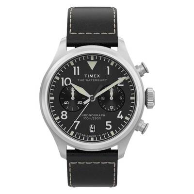 Silver-tone stainless steel case, black leather strap, fixed silver-tone bezel, black dial with silver-tone hands and index markers, minute markers, analog dial type, date display at 6 o'clock, chronograph with 60-second and 24-hour sub-dials, quartz movement, scratch-resistant mineral crystal, push/pull crown, solid case back, round 41mm case, 9.5mm thick, 20mm band width, buckle clasp, 100m/330ft water resistant, functions: chronograph, date, hour, minute, second, Waterbury Series, casual style