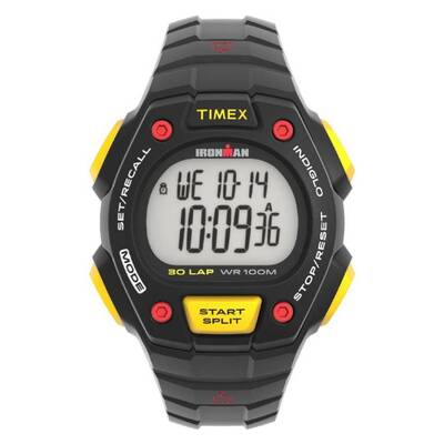 Black resin case and strap, fixed black resin bezel, digital dial, quartz movement, scratch resistant acrylic crystal, pull/push crown, solid case back, round 40mm case, buckle clasp, 100 meters water resistant, date, day, hour, minute, second functions, Ironman Classic Series, sport watch style.