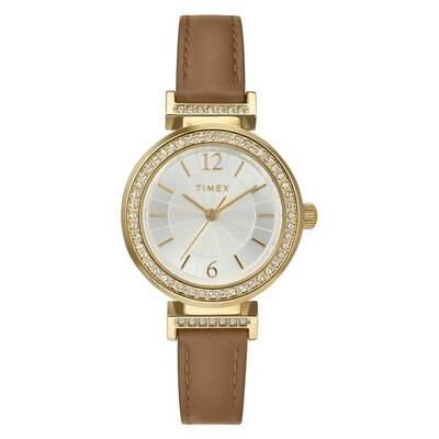 Gold-tone brass case with brown leather strap and fixed gold-tone bezel crystal set. Silver dial features gold-tone hands and index-Arabic numeral markers. Analog quartz movement with scratch-resistant mineral crystal and pull/push crown. Solid case back on a 31mm round case (9mm thick). Equipped with buckle clasp and water resistance up to 30 meters / 100 feet. Functions include hour, minute, and second indicators. Belongs to the Trend Series and is a casual watch. Item: TW2W49000JI