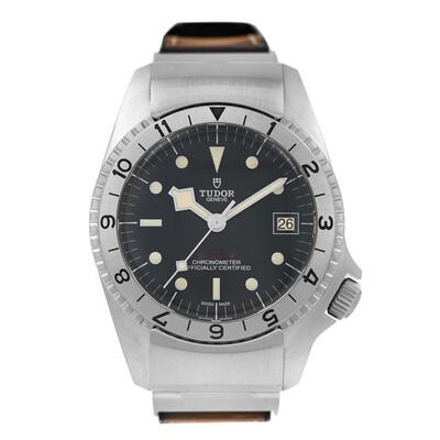 Silver-tone stainless steel case with a brown leather strap. Bi-directional rotating silver-tone stainless steel bezel. Black dial with silver-tone hands and index hour markers. Minute markers around the outer rim. Dial Type: Analog. Luminescent hands and markers. Date display at the 3 o'clock position. Tudor Calibre MT5612 Automatic movement, containing 26 Jewels, bitting at 28800 vph, and has a power reserve of approximately 70 hours. Scratch resistant sapphire crystal. Screw down crown. Solid case back. Round case shape, case size: 42 mm. Fold over clasp with a safety release. Water resistant at 200 meters / 660 feet. Functions: date, hour, minute, second, chronometer. Black Bay Series. Luxury watch style. Watch label: Swiss Made. Item Variations: 70150-0001. Pre-owned Tudor Black Bay Automatic Chronometer Black Dial Mens Watch M70150.