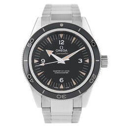 Pre-owned Omega Seamaster 300 Automatic Black Dial Mens Watch (Article 233.30.41.21.01.001). Features a stainless steel case, black ceramic bezel top ring, black dial with luminous silver-tone arrow-shaped hands and Arabic numerals at 3,6,9,12 o'clock positions, minute markers, analog dial type, Omega calibre 8400 automatic movement with 39 Jewels, 25200 vph, 60-hour power reserve, sapphire crystal, screw-down crown, transparent case back, 41mm round case, 14.65mm thickness, 21mm band width, deployment clasp, 300m/1000ft water resistance, hour, minute, second functions, co-axial escapement, chronometer certified, anti-magnetism feature, part of the Seamaster 300 Series, luxury style, Swiss Made.