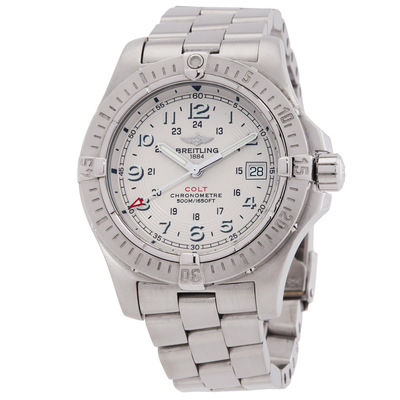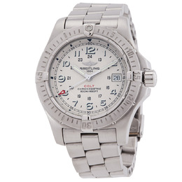 Stainless steel case with a silver-tone stainless steel bracelet. Uni-directional rotating bezel. Silver dial with luminous hands and Arabic numeral hour markers. Minute markers around the outer rim. Dial Type: Analog. Luminescent hands and markers. Date display at the 3 o'clock position. Breitling Calibre 74 quartz movement. Scratch resistant sapphire crystal. Screw down crown. Solid case back. Round case shape, case size: 41.1 mm, case thickness: 13.3 mm. Tang clasp. Water resistant at 500 meters / 1650 feet. Functions: date, day, second time zone, hour, minute, second. Colt II Series. Luxury watch style. Watch label: Swiss Made. Pre-owned Breitling Colt II Silver Dial Stainless Steel Black Leather Mens Watch A7438010-G598.