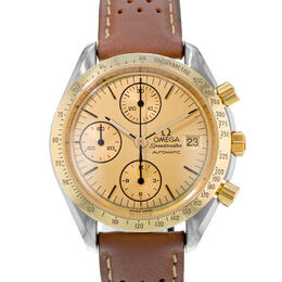 Pre-owned Omega Speedmaster Date Chronograph Automatic Mens Watch 3311.10. Silver-tone stainless steel case with a brown leather strap. Fixed tachymeter bezel with yellow gold-tone 18kt yellow gold insert. Gold-tone dial featuring yellow gold-tone hands and index hour markers, including minute markers around the outer rim. Luminescent-coated hands. Date display at the 3 o'clock position. Automatic self-winding movement. Solid case back. Round case shape measuring 38 mm. Equipped with a fold over clasp featuring a safety release. Functions include chronograph, date, hour, minute, second. Speedmaster Date Series, Swiss Made luxury watch.