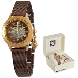 Gold-tone metal case with a brown metal mesh bracelet. Fixed gold-tone metal bezel with an attached Swarvoski crystalset heart charm. Brown (Swarvoski crystal-set center) dial with gold-tone hands and Arabic numeral hour markers. Minute markers around the outer rim. Dial Type: Analog. Quartz movement. Scratch resistant mineral crystal. Pull / push crown. Solid case back. Round case shape. case size: 28 mm. Band width: 14 mm. Jewelry clasp. Water resistant at 30 meters / 100 feet. Functions: hour, minute, second. Casual watch style. Anne Klein Ladies Swarvoski Crystal Brown Dial Watch AK/3501BRST.