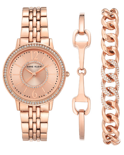 Rose gold-tone metal case and bracelet, fixed rose gold-tone metal bezel set with Swarovski crystals, rose dial with rose gold-tone hands and Swarovski crystal-tipped indices, Arabic numerals at 6 and 12 o'clock, minute markers, analog dial, quartz movement, scratch-resistant mineral crystal, pull/push crown, solid case back, round shape, case size 34.4mm, case thickness 8.3mm, band width 13.7mm, jewelry clasp, water resistant to 30 meters, hour, minute, second functions, includes one rose gold-tone bangle and one rose gold-tone chain bracelet set with 96 clear Swarovski crystals, dress watch style, Japan movement.