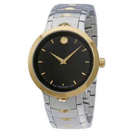 Stainless steel case with two-tone (silver-tone and yellow gold-tone) stainless steel bracelet. Fixed yellow gold PVD bezel. Black dial with gold-tone hands and index hour markers. Minute markers around the outer rim. Movado dot at the 12 o'clock position. Analog quartz movement. Scratch resistant sapphire crystal. Pull/push crown. Solid case back. 40mm round case. Deployment clasp with push button release. 30 meters / 100 feet water resistant. Hour, minute functions. Sport watch style. Swiss Made.