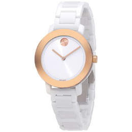 White ceramic case, white ceramic bracelet, bronze bezel, white ceramic dial, bronze hands, no markers, 12 o'clock Movado logo, analog quartz movement, scratch-resistant mineral crystal, push-button fold-over clasp, round 36mm case, 8mm thickness, 16mm band width, water resistant to 30 meters, hour and minute functions, Swiss Made.