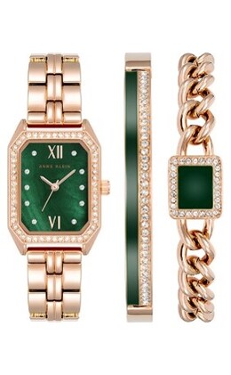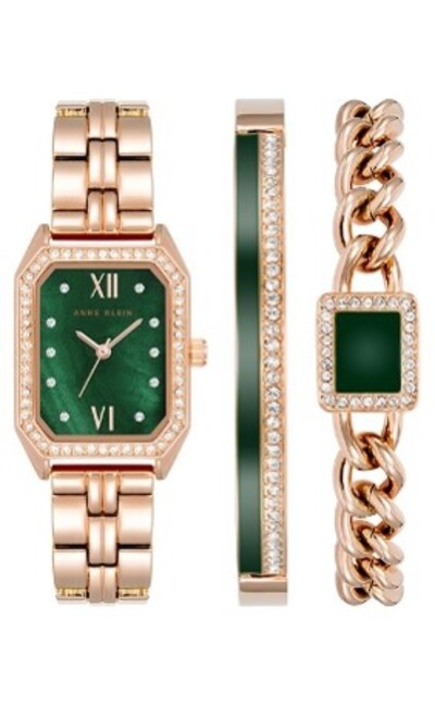 Anne Klein ladies watch with rose gold-tone metal case and bracelet, fixed rose gold-tone bezel with crystals, green dial featuring rose gold-tone hands and crystal Roman numeral markers, analog dial, quartz movement, scratch-resistant mineral crystal, pull/push crown, solid case back, rectangular shape, jewelry clasp, hour, minute, second functions, includes two matching crystal-accented bracelets, dress watch style.